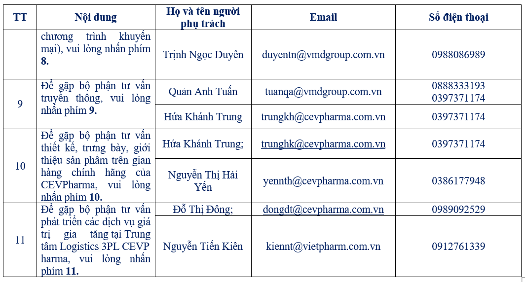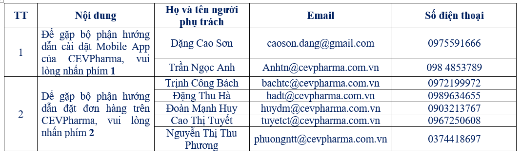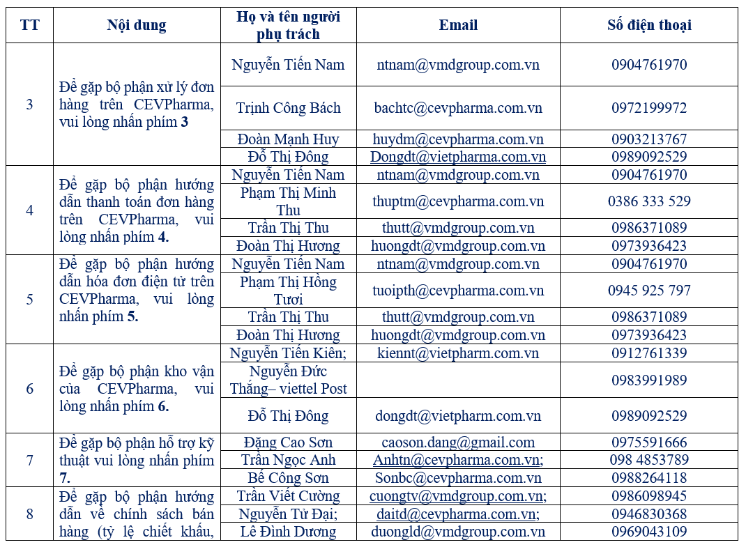 2. Danh sách nhân sự hỗ trợ NVPTKH của Viettel Port và Cộng tác viên của CEVPharma cho các mặt nghiệp vụ
