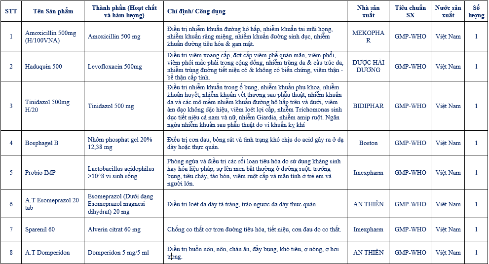 (1) Amoxicillin 500mg; Haduquin 500 và Tinidazol 500mglà phối hợp 03 kháng sinh hiệp đồng trong điều trị diệt vi khuẩn HP.